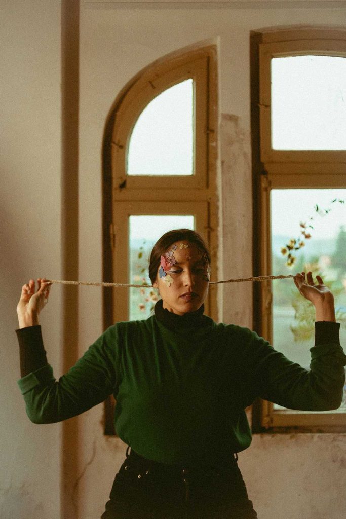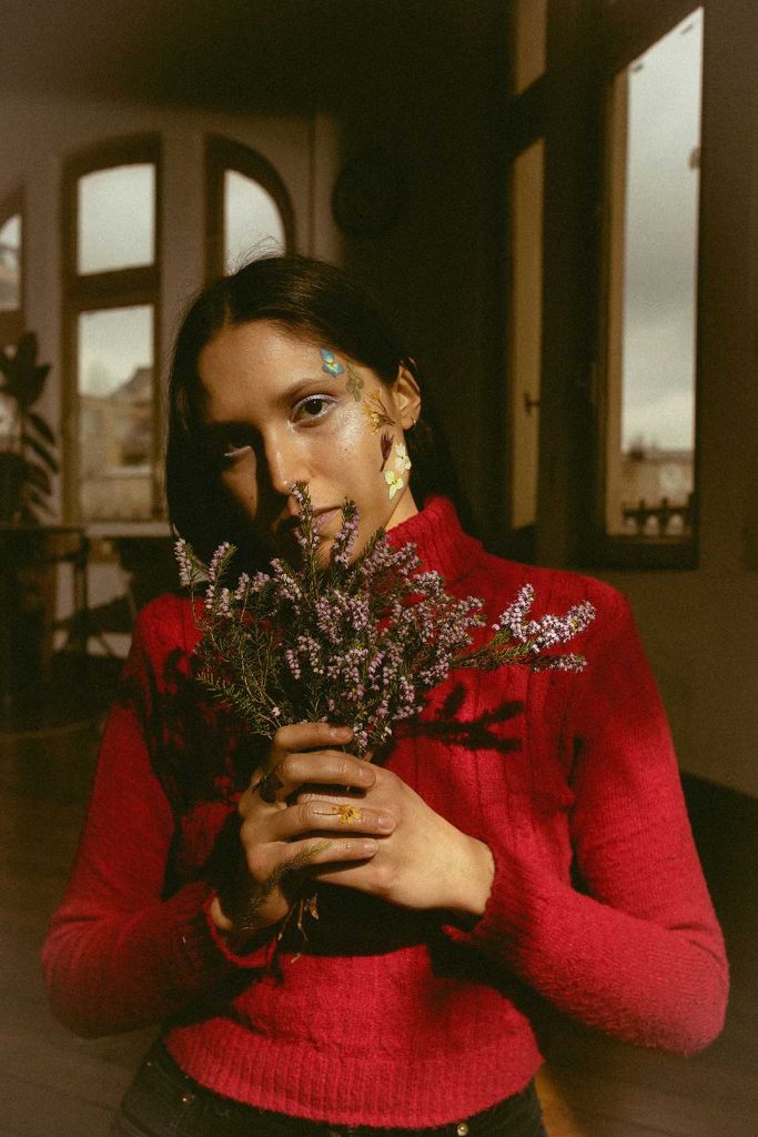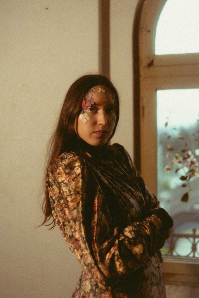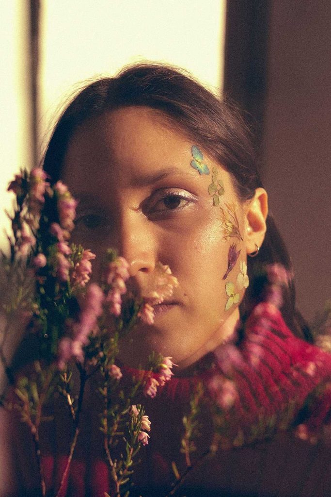 Sobre el arte de la portada, fue todo un viaje realizarla, pues el retrato viene de una sesión que hicimos en junio 2023 junto a la fotógrafa Fabiola Pontigo, justo en el momento en que nos encontrábamos ensayando y comenzando a grabar el disco con la banda. Luego en febrero 2024, comencé a hacer collages con flores prensadas, y también a explorar el estampado textil botánico, junto a Susana Soto (@pandora.labtextil). De ahí que la portada tiene toda la magia de esa exploración botánica, desde las telas estampadas, hasta las flores prensadas y también unas fotos análogas, diseño que realizamos en conjunto con Bárbara Guerrero.